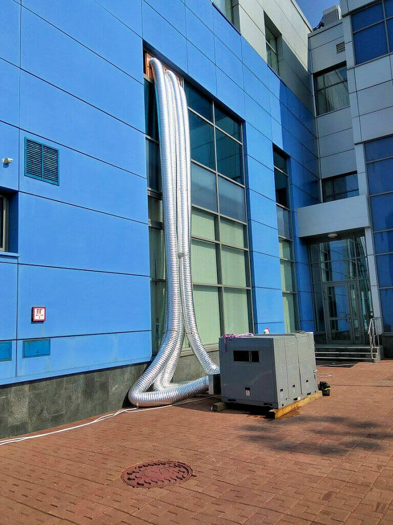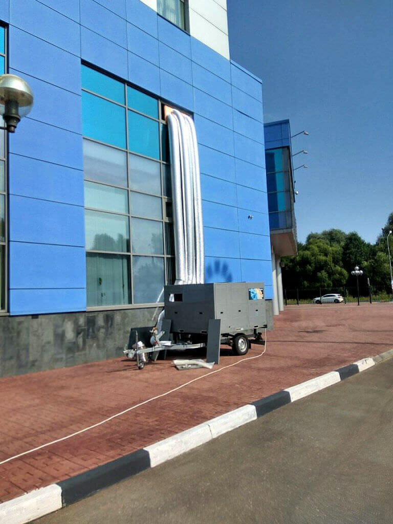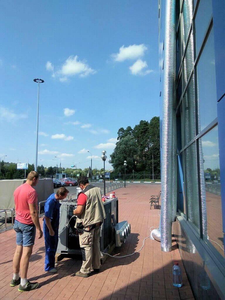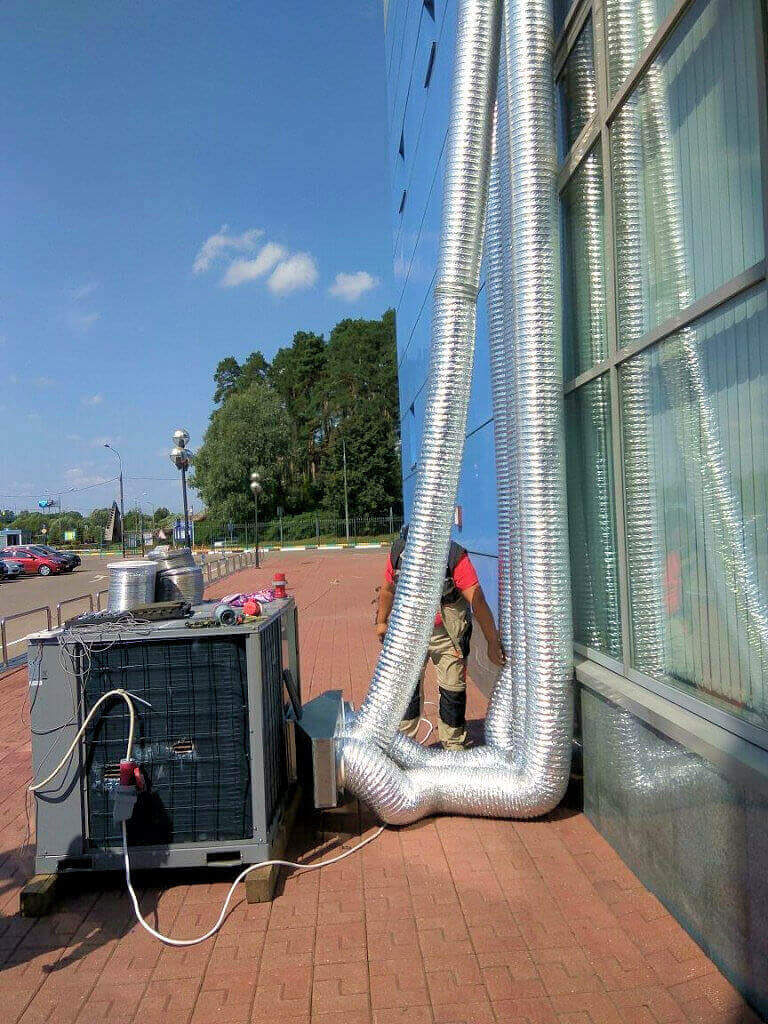 Кондиционирование промышленного помещения на день строителя в г. Видное. Для охлаждения помещения использовали Rooftop мощностью 53 кВт‑2 шт и 35 кВт ‑1 шт. На мероприятии было около 300 человек гостей. Задача выполнена.